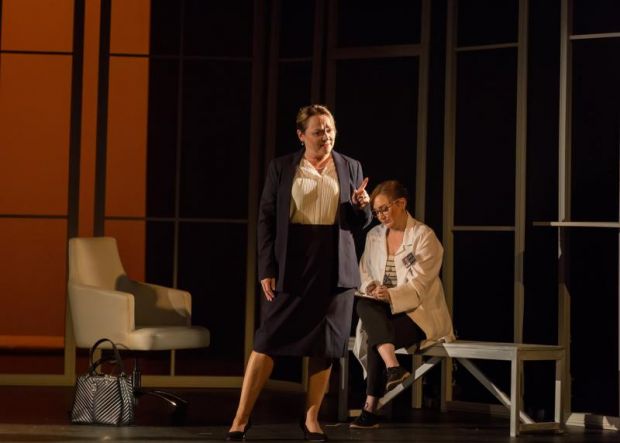 As is the condition, the set is stark and uncluttered with multiple open windows that in their own way are symbolic. Importantly, this allows the audience to see the projected slides that accompany a lecture on a new drug and its impact on brain cells that threads through much of the story. Complex lighting designed by Ricard Parkhill is purposeful and is an important tool in the story telling. The use of strong lighting colour creates mood and ambiance, underlining difficult parts of the story and making a powerful wordless impact.