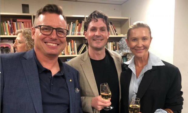 Diana Simmonds Chair of the Rodney Seaborn Playwrights Award Trustees Panel with 2025 winner of $20,000 RSPA: Brisbane playwright Elaine Acworth and successful S,B &W Foundation Grant recipients ($35,000) Nicholas Paine and Claire Styles from The Dead Puppets Society (QLD).