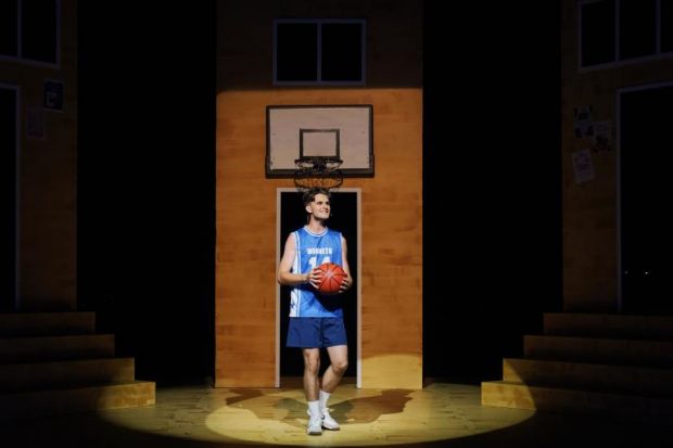 The staging is simple but clever, built on a painted wooden floor with three flats featuring stairs and doors, and a basketball hoop planted centre stage to immediately evoke a classic American high school gymnasium. Lockers with familiar high school graffiti and a trophy case are wheeled on to transform the space into a hallway, before those same trophy cases are flipped to reveal nerdy sword memorabilia, turning the stage into Ned Gold’s bedroom – very clever!