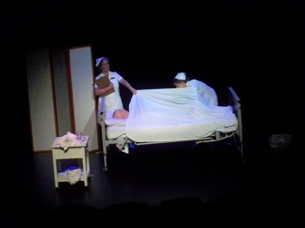 More a sketch than a play, in Joyce Carol Oates’ Procedure we see a senior Nurse A (Andrea Blight) instructing an inexperienced Nurse B (Charlotte McKee-Wright) on how to prepare the corpse (Brian Carbee) in front of them for the morgue. The details of removing pyjamas, washing, arranging the body and stuffing every orifice are all done and ticked off. Nurse A makes quizzical observations about the body but B remains severely professional.