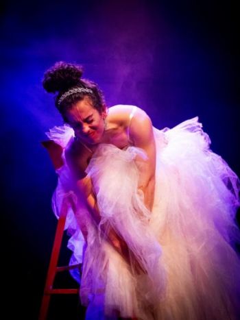 A version of the Cinderella character (Grace Gemmell) who wears an inhibiting ball gown, is trapped on a ladder by her shoe (could it be the glass slipper?). Frantic, she yells for help but is only advised and chastised by a supercilious dandy version of the White Rabbit (Charlie Veitch in fine form) from Alice in Wonderland. (Strictly speaking, is that a fairy tale? Disney-fied, yes.) This Cinderella gets the line, ‘I’m late, I’m late’ which she delivers on the edge of panic as if her life depends on it. It does. She’s late for Prince Charming. The callous Rabbit coldly gives her horrendous advice...