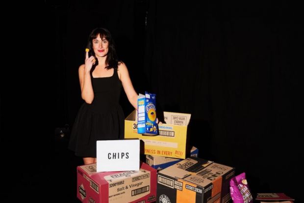 The obsession with chips might seem arbitrary – there for the sake of a pun – and chips could be ice cream or chocolate or pickles. Let’s say it works as an obsession. The show begins with what looks like an orgasm brought on by a jumbo pack of Smith’s Crisps. But how can she eat all those chips? I did wonder about Kate’s weight – as much as she does. Was she a little fat girl as a child? She certainly isn’t now. Vanessa Buckley is tall, lithe and supple. At one point, she dances and so well that we want more. But we don’t get it. It’s just Kate letting off steam.