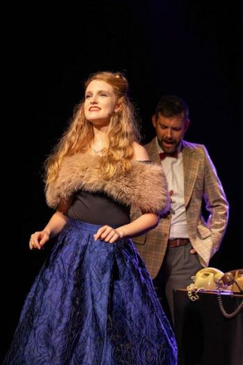 Bronwyn Dyer impresses in vastly different dual roles as the self-assured Hollywood WAG Carla Haywood and the sultry femme fatale Alaura Kingsley, displaying remarkable acting range and conveying both characters with conviction and confidence. She presents a distinct difference between the two, leaving no room for confusion — stagey and one-dimensional in the “screen” world, then transforming into the three-dimensional realism of the other role.
