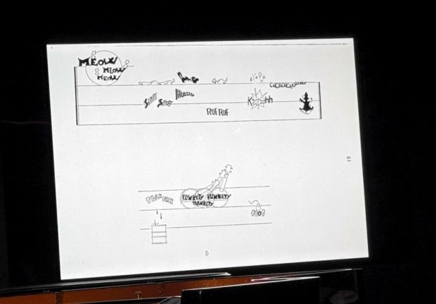 Cathy Berberian’s Stripsody was another graphic playground we could enjoy on screen. The score unfolded like a comic book cracking to life. Pops, bangs, whooshes, squeaks; the music consisted of an A-Z of onomatopoeia. Raineri fearlessly unleashed a flurry of vocal acrobatics as we watched the score on screen, matching it with the creative leaps he was making in real time.