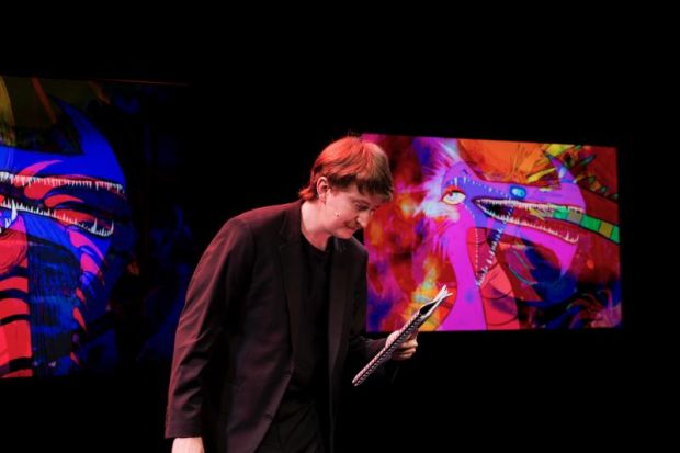 Dragon I is a show written by and starring Adam Kelly. Adam Kelly is obsessed with dragons and has written (an unpublished) book series featuring his favourite creations. In this hour-long play, co-written with director James Berlyn, and collaborator Jade Del Borrello, Adam ponders what would happen if he let AI finish his book series.