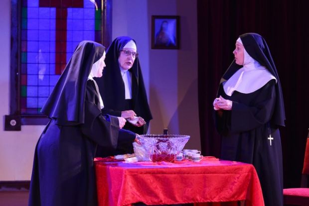 Sister Philomena (Jenny Anderson) and Sister Augusta (Tonia Davis) introduce the play as they abandon their stitching to bottle the wine – and some communion grape juice. Both Anderson and Davis portray the secretive nervy-ness of the conspiring Sisters, especially when surprised by Mother Superior (Maggie Scott) whom they treat with the reverence and awe Scott demands of them.