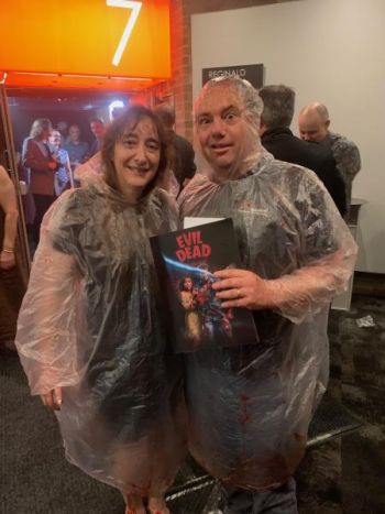 We were assigned seats A9 and A10. During interval ponchos were provided to repel the fake blood. You think you are safe if someone is being stabbed on stage left – but no there are little squirters coming in all directions. (Ruth and David Spicer, pictured right.)