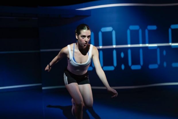 For 100 minutes the actors are virtually “in training” on a bare stage framed by a high, curved blue track to which designer Kate Beere adds a white lane line that pulls into recesses behind the stage. The set implies distance and, cleverly, a sense of oppression that works perfectly on the compact Old Fitz stage.