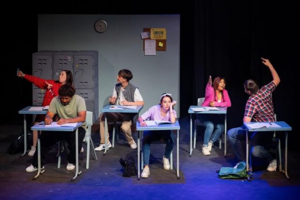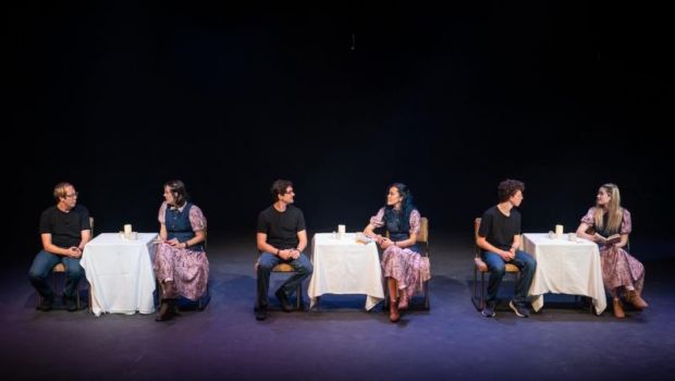 After interval, one act play Sure Thing by David Ives, directed by AJ Giltrow, follows a couple’s interactions over multiple repetitions of their encounter in a café. It features three of each of the characters, in a high paced, quarter hour show. Lovely performances from Candace Preston, Natalie Wiles, and Clara Lee as Betty, nicely matched by Jack Buckmaster, Jake Schmid and Harrison Ricci as Bill. Simply set from a design by the director, it features lighting design by Devlin Turbin.