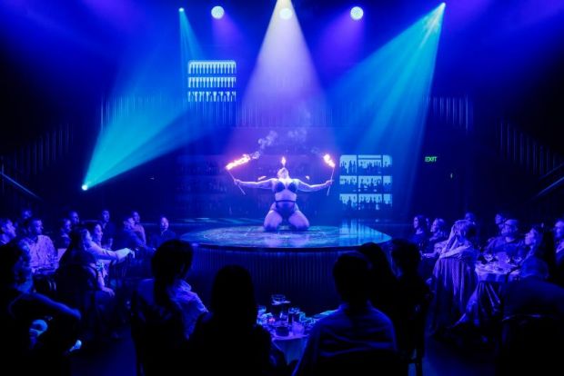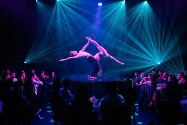 Immerse yourself in a decadent world of burlesque and adults only circus. Taking the stairs down to the lower level of the Studio at the Opera House, it’s easy to imagine you’re stepping into a subterranean 1920s bar inspired by F. Scott Fitzgerald’s The Great Gatsby. For many audience members it’s a genuinely immersive experience, seated at tables around a sweeping bar, served by lively engaging wait staff, soon to transform into the production’s splendidly choreographed (Lucas Newland), top notch ensemble.