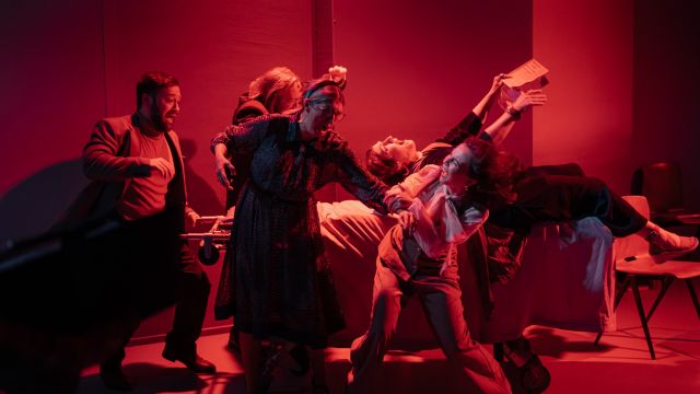 Director Sekuless’s attention to detail can be seen in the coherence in all aspects of the design. The walls of the committee room are a cool light blue which evokes both a clinical setting but are also on a shade gradient like the sky, a nod to the traditional position of God. The costumes however are shades of brown and orange, a reminder that while the Committee is playing God, they are of the Earth. The sound and lighting designs are used to take the viewer out of the committee room and to illuminate mimed scenes of tragedy, giving the audience a visual to match the dialogue. These work well in the main, although one was a little ambiguous and therefore confusing.