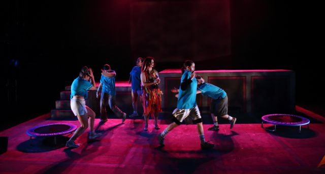 To one side of the stage is the band – Jackson Cross, guitar; Darby Ferguson, bass; and Nicholas Costa, drums – who provide bursts of rock music and comic sound effects, but they are also, just to weave them into the fabric of things, Trampoline World’s stroppy maintenance crew.