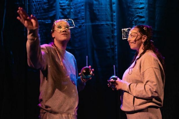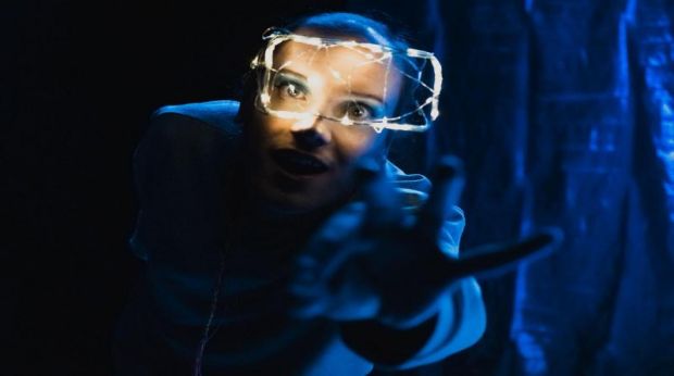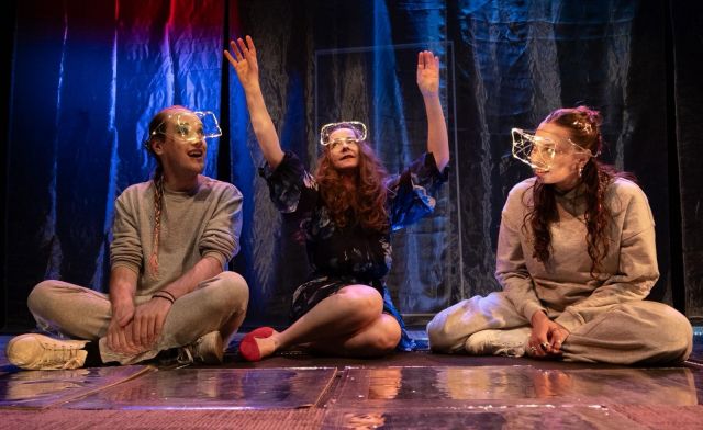Now can be confusing in its logic and in its storytelling choices. Entry into Now seems to be achieved simply by believing it exists (i.e. it’s there all the time) and is indicated by the characters wearing a head piece rather like Virtual Reality headset, ringed by tiny lights. Then, at various times, characters turn over carpet tiles to reveal mirrored surfaces underneath which they regard with wonder. No explanation is offered for this, but we learned after the show that the mirrors are substitutes for projections that the production could not afford. The Mother undergoes several costume changes whether of her own volition or because of Now it is difficult to say. Eventually, all are freed, and the play seems to tell us that that we must recognise that Now is there for all of us – if we choose.