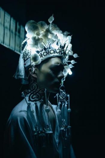 Yu Tien Lin provides a sensational vocal range includes a high-pitched song that is ghostly and mournful, he is impeccably dressed in traditional white costume includes a glowing head dress. He intricately part of the ensemble, but his solo performance is heart wrenchingly powerful and spiritual.