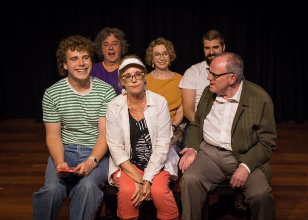 ‘Road Trip’ by Jan Probst sees Lindsay Dunn’s Allen setting up for a long drive around America with his wife Mary (played with great sarcasm by Joanne St Clair) before being joined by other family members crowding in the car. It’s a clever piece of make-believe within a play and the ensemble create lots of laughs by playing it straight.