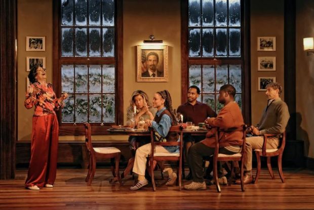 We’re in the rich mahogany home of Father Solomon Jasper (Marcus Hamilton), beautifully detailed by designer Jeremy Allen, as snow falls beyond the windows. From the wall Martin Luther King gazes down at his old friend, as Jasper sits, retired now and obsessed with beekeeping. Hamilton excels as Father Jasper, his restless reaching to be back in God’s light, as he bemoans his past moral failings and sexual betrayal – and tonight, the even heavier disappointments of his two hopeless sons.