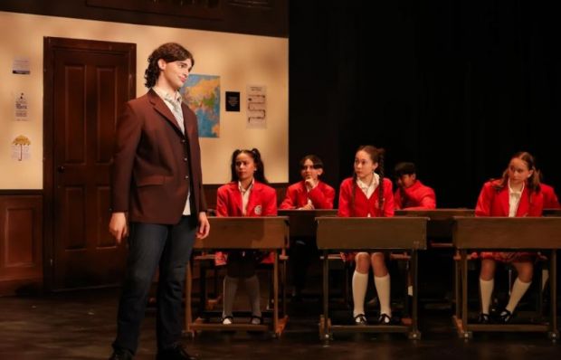 Anna Dinyes (The Mystery of Edwin Drood, Urinetown, Pippin) delivers a captivating performance as Principal Rosalie Mullins, effortlessly balancing stern authority with hidden vulnerability. Her crystalline soprano soars breathtakingly in “Queen of the Night”, a dazzling display of technical brilliance, while her Act Two solo “Where Did the Rock Go” pulses with heartfelt warmth and emotional intensity. Dinyes masterfully transforms from a strict, no-nonsense disciplinarian into a richly layered, relatable, and unforgettable character, showcasing extraordinary acting skills that bring depth, nuance, and emotional authenticity to every moment on stage.
