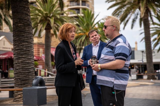 Small Metal Objects is a series of moments captured in time against a backdrop of societal mundanity. The audience are confined in raked, arena-type seating, backs to the ocean and gazing out to the buzz of activity in Moseley Square. As we anticipate and then watch the performance, it is us that become spectacle as passers-by observe our headphone-wearing group. Correspondingly, the community in the Square are unwitting extras within the performance, and fiction co-existing with reality presents many other layers during the 50 minute performance.