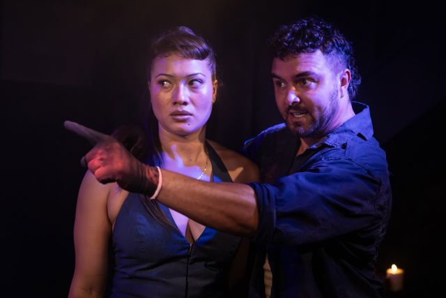 On a remote outback farm, an old woman dies. Three letters are sent to three siblings: they must come ‘home’ for their inheritance. The homecoming of scattered family members is a familiar trope. But here, first, there’s an eerie note as the Storyteller (Glenn Shea himself) teaches the cast a sweet, melodious little song in language, and blows red and yellow ochre dusts over their heads. Sound designer Elissa Goodrich gives us the screech of hawks overhead. That Shea chooses to begin his story this way and introduce his characters in the fresh open air, in daylight, on the La Mama HQ forecourt is nice theatrical decision because what follows, inside, in the theatre itself, will become very dark indeed.