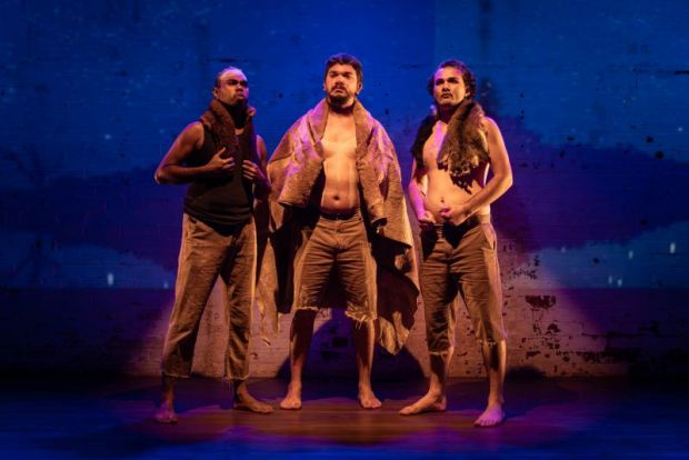 Their location on the river, as depicted in the giant projections by Shane Grant of the Murray River by day and by starry night across the theatre wall, and B J Keene’s soft soundscape, is beautiful and bountiful, but the invaders can’t – or won’t – see that.