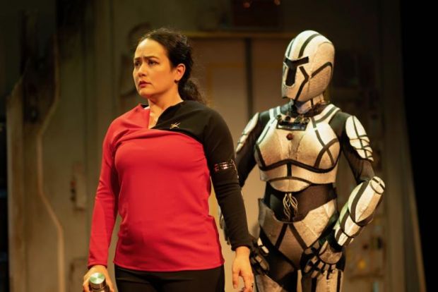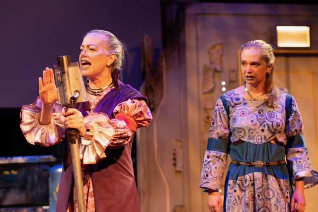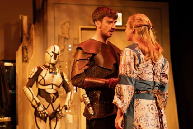 The opening scene, (or the tempest scene) set in a spaceship, projected onto the rear wall, where we meet people from different planets such as Milan, and a crew in Star Trek inspired uniforms. Nicely filmed, under the direction of Stephen Lee, cuts and green screen feel a little retro, and we get our first glimpse of the Space meets Tudor costuming from Merri Ford and the highly creative makeup from Yvette Drager Wetherilt.