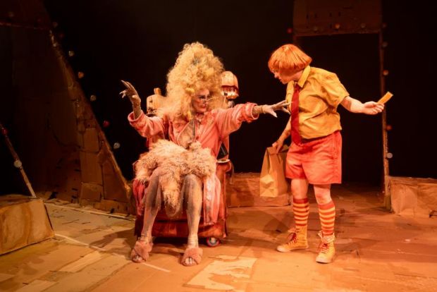 Our hero, underdog Gil is a potbellied little guy with a pudding bowl haircut and his demeaning MacDonald’s uniform. Gil’s scornful and oppressive Mama (Natasha Herbert) is a ludicrous figure in a wheelchair, labouring beneath a huge 18th century style wig. This Weight-of-the-Past figure would keep Gil (literally) underfoot forever. Gil’s Boss (Aya), prominent chest counterbalanced by cantilever bum, is so ambitious, so dominating, mean, and nasty that her only friend is… Gil. Then there’s motormouth opportunist showman, a rhinestone cowboy (James Cerce) who senses success in Gil’s rooster and moves in on him. And finally, Odysseus Rex himself, a muscle-bound, dim-witted rooster born and bred only to fight – and win, of course - who does not greet the sun but instead challenges it every dawn.